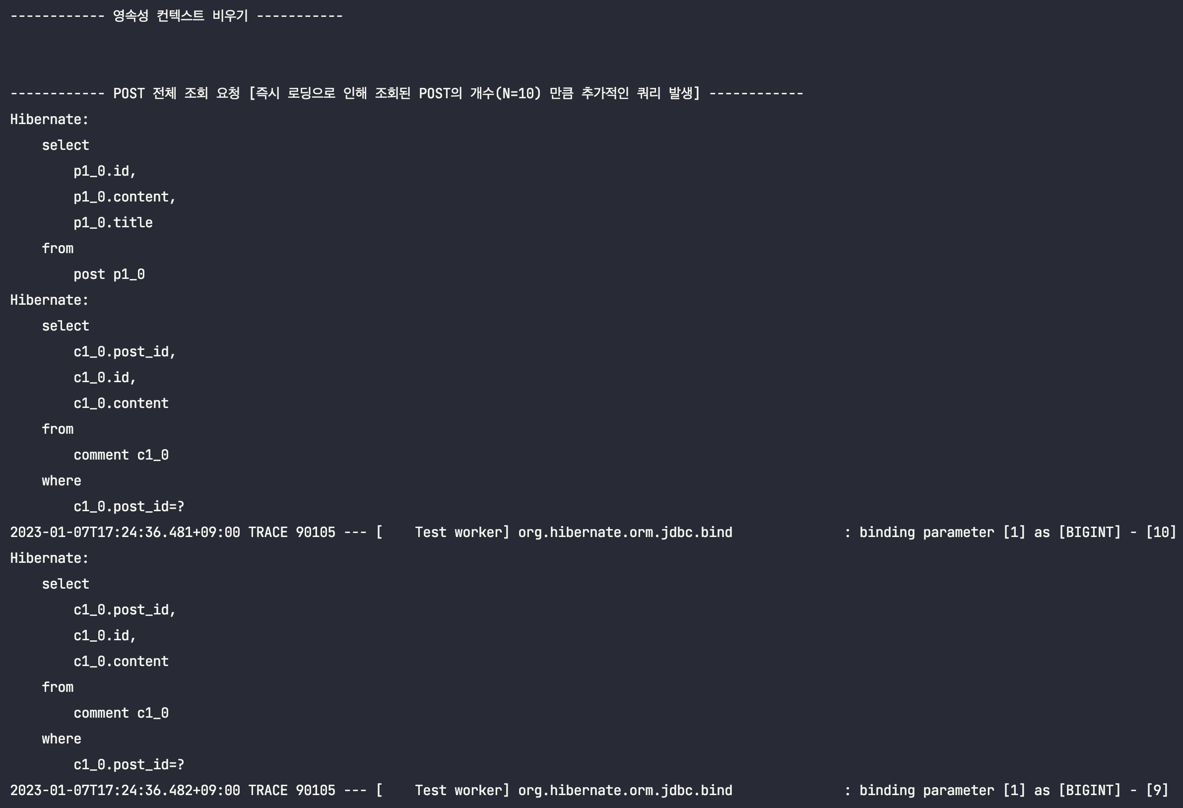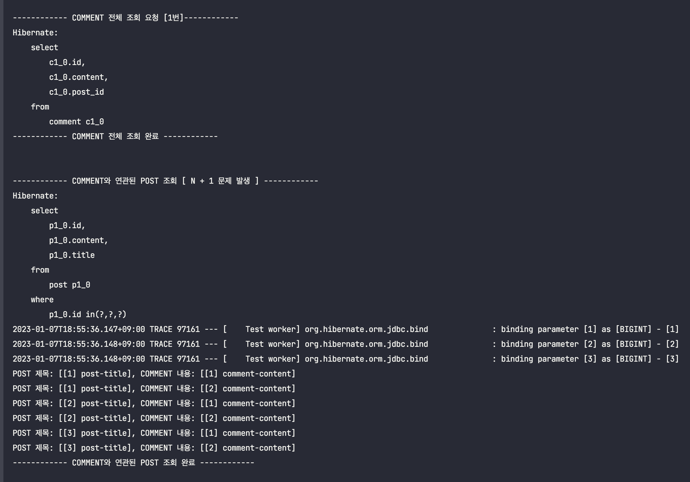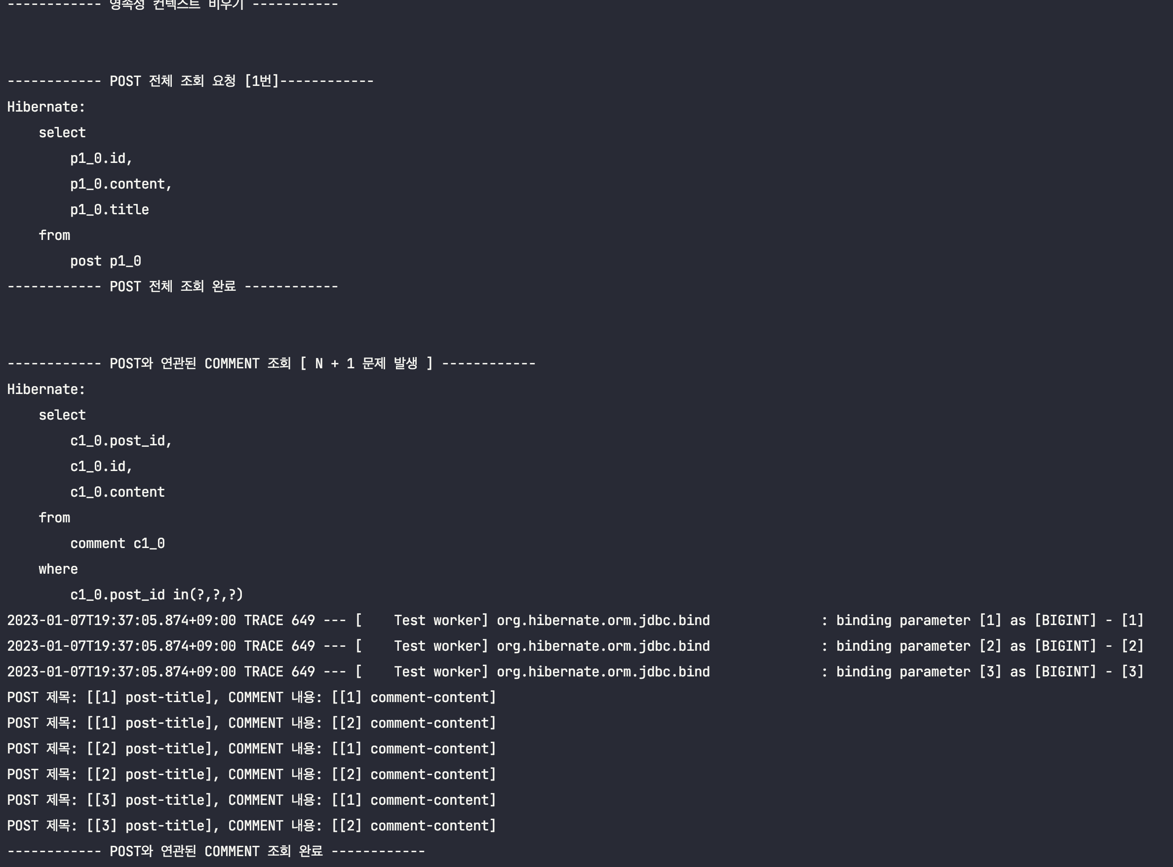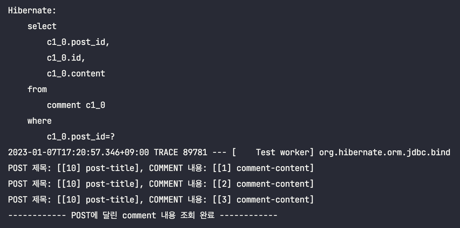 ์ด๋ฅผ ํ์ธํ๊ธฐ ์ํด, Post์์ Comment๋ฅผ ์ฆ์ ๋ก๋ฉ์ผ๋ก ์กฐํํ๋๋ก ๋ณ๊ฒฝํ ๋ค, ์์ ํ ์คํธ์ฝ๋๋ฅผ ๊ทธ๋๋ก ์คํ์์ผ๋ณด๋๋ก ํ๊ฒ ์ต๋๋ค.(์ถ๋ ฅ๋ฌธ๋ง ์ดํด๋ฅผ ๋๊ธฐ ์ํด ์์ ํ๋๋ก ํ๊ฒ ์ต๋๋ค.)
