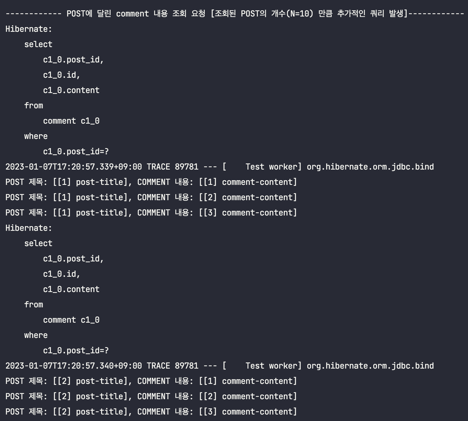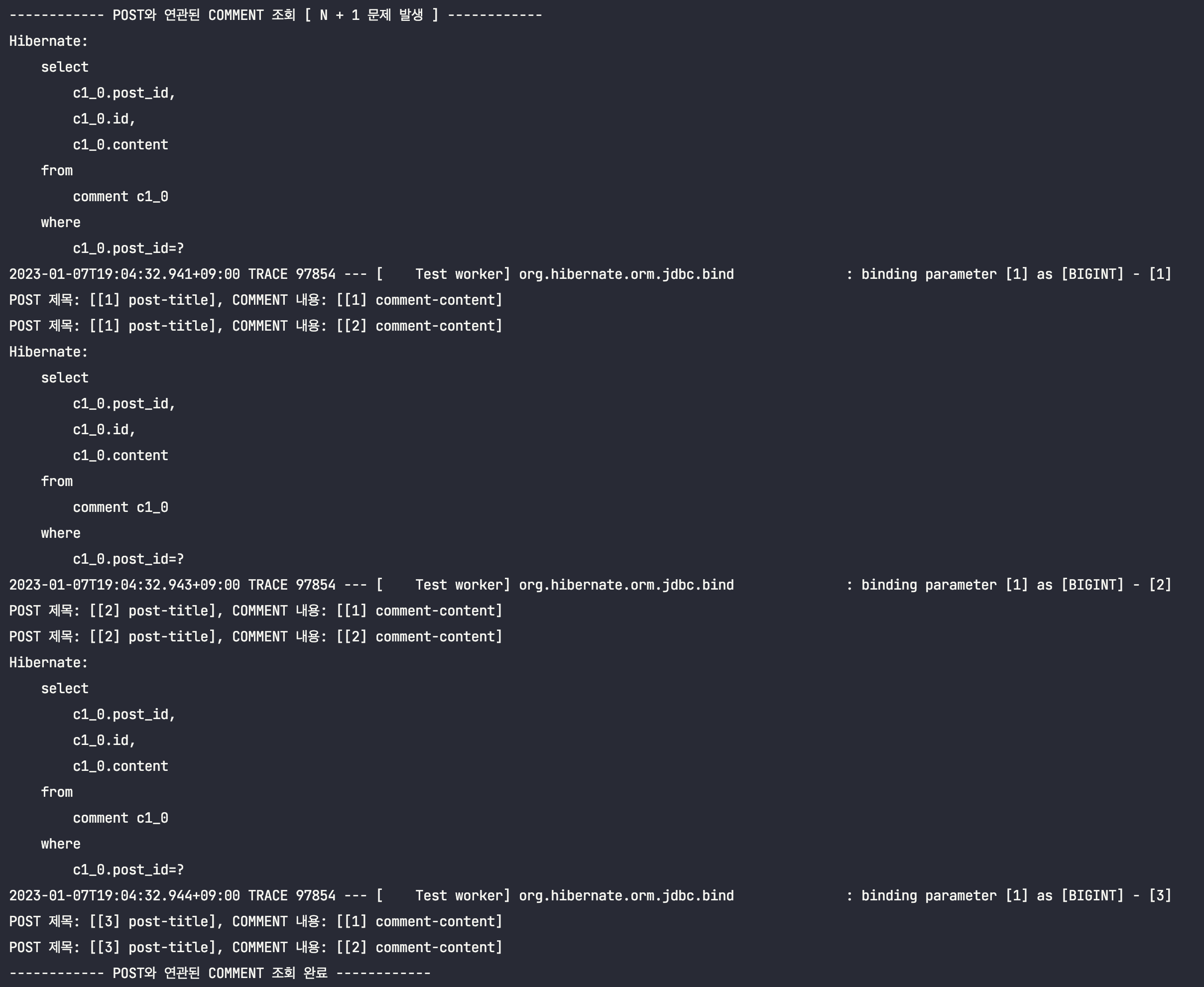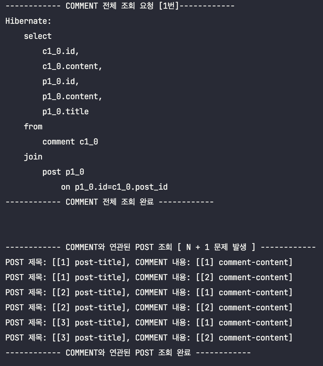 ์ด๋ฅผ ํ์ธํ๊ธฐ ์ํด, Post์์ Comment๋ฅผ ์ฆ์ ๋ก๋ฉ์ผ๋ก ์กฐํํ๋๋ก ๋ณ๊ฒฝํ ๋ค, ์์ ํ ์คํธ์ฝ๋๋ฅผ ๊ทธ๋๋ก ์คํ์์ผ๋ณด๋๋ก ํ๊ฒ ์ต๋๋ค.(์ถ๋ ฅ๋ฌธ๋ง ์ดํด๋ฅผ ๋๊ธฐ ์ํด ์์ ํ๋๋ก ํ๊ฒ ์ต๋๋ค.)