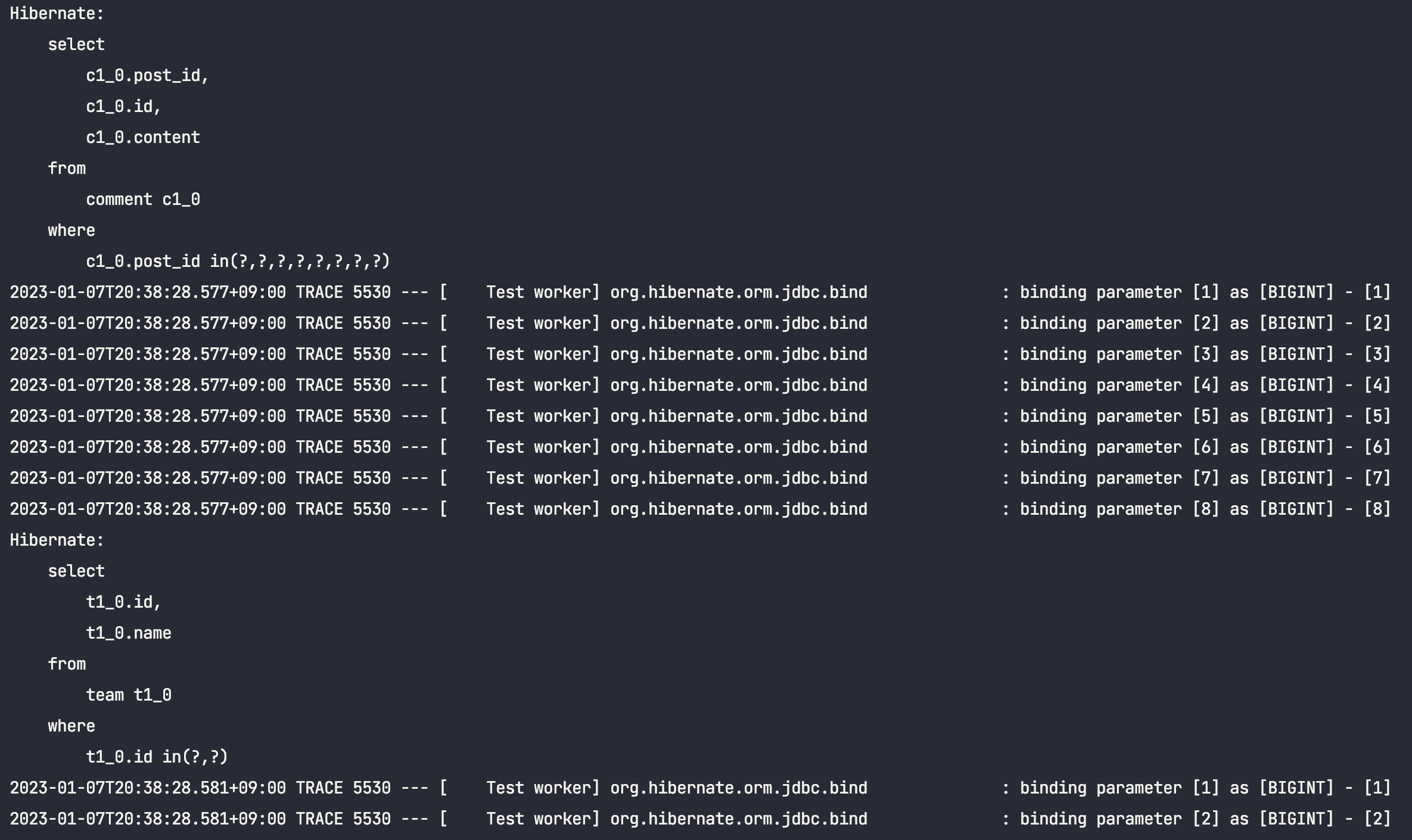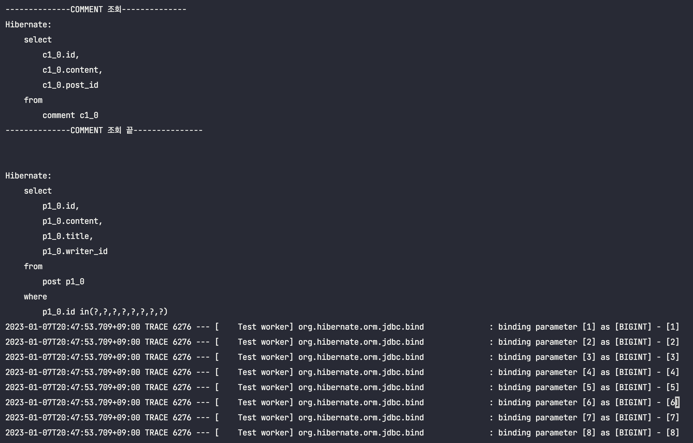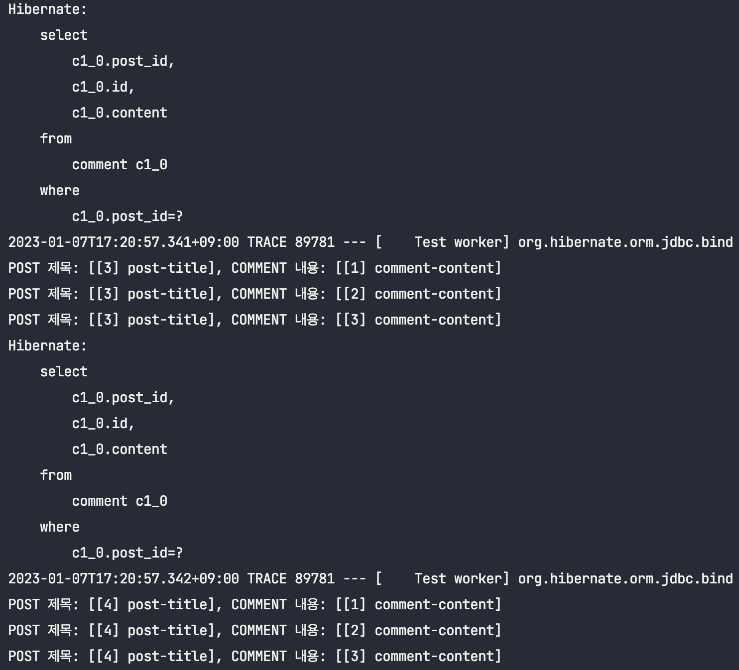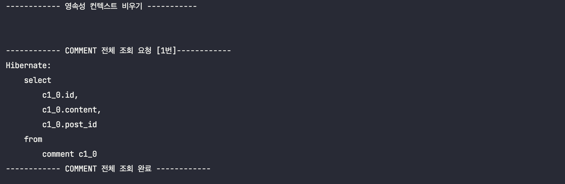 ์ด๋ฅผ ํ์ธํ๊ธฐ ์ํด, Post์์ Comment๋ฅผ ์ฆ์ ๋ก๋ฉ์ผ๋ก ์กฐํํ๋๋ก ๋ณ๊ฒฝํ ๋ค, ์์ ํ ์คํธ์ฝ๋๋ฅผ ๊ทธ๋๋ก ์คํ์์ผ๋ณด๋๋ก ํ๊ฒ ์ต๋๋ค.(์ถ๋ ฅ๋ฌธ๋ง ์ดํด๋ฅผ ๋๊ธฐ ์ํด ์์ ํ๋๋ก ํ๊ฒ ์ต๋๋ค.)