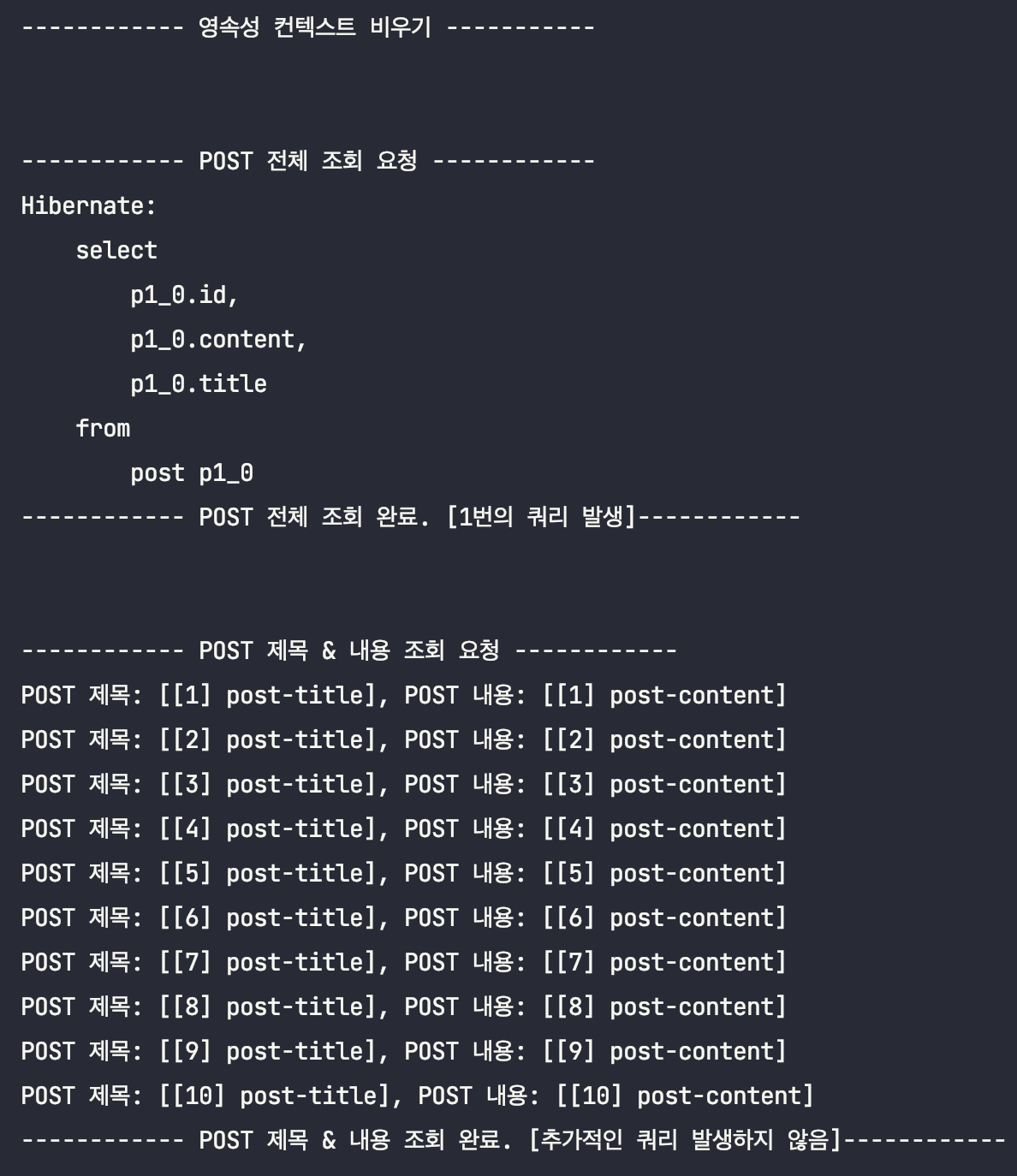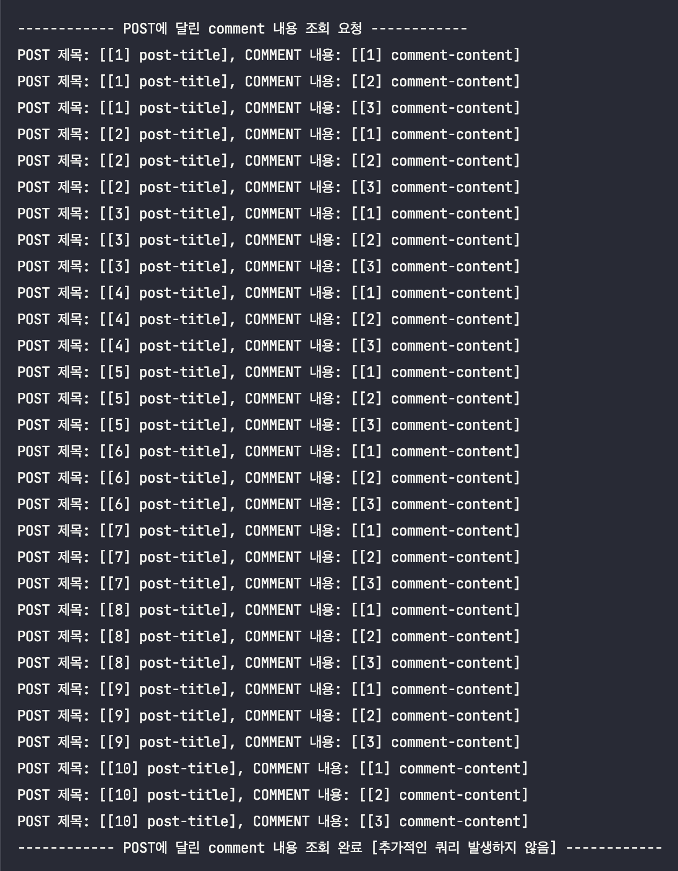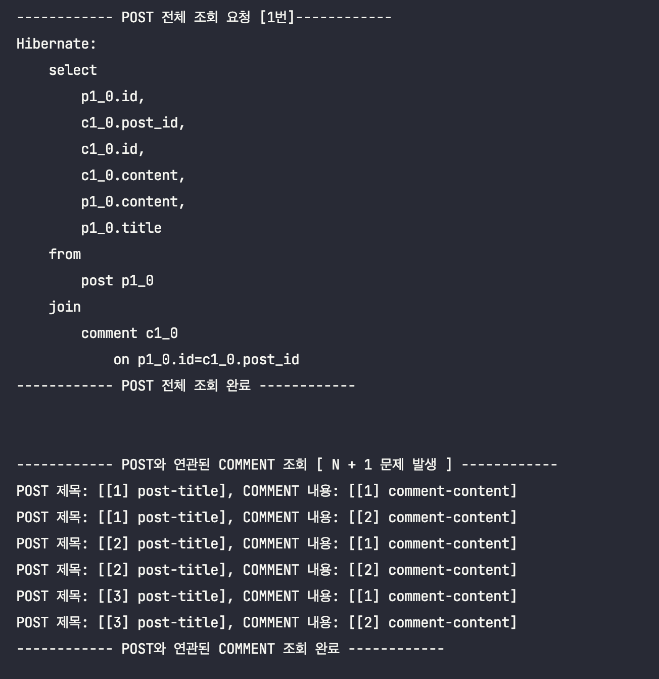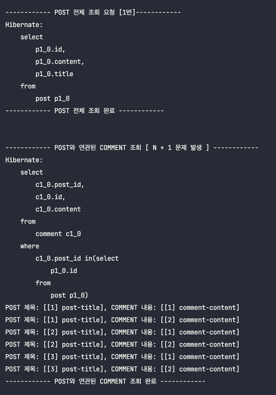 System.out.println("------------ POST ์ ๋ชฉ & ๋ด์ฉ ์กฐํ ์๋ฃ. [์ถ๊ฐ์ ์ธ ์ฟผ๋ฆฌ ๋ฐ์ํ์ง ์์]------------\n\n");