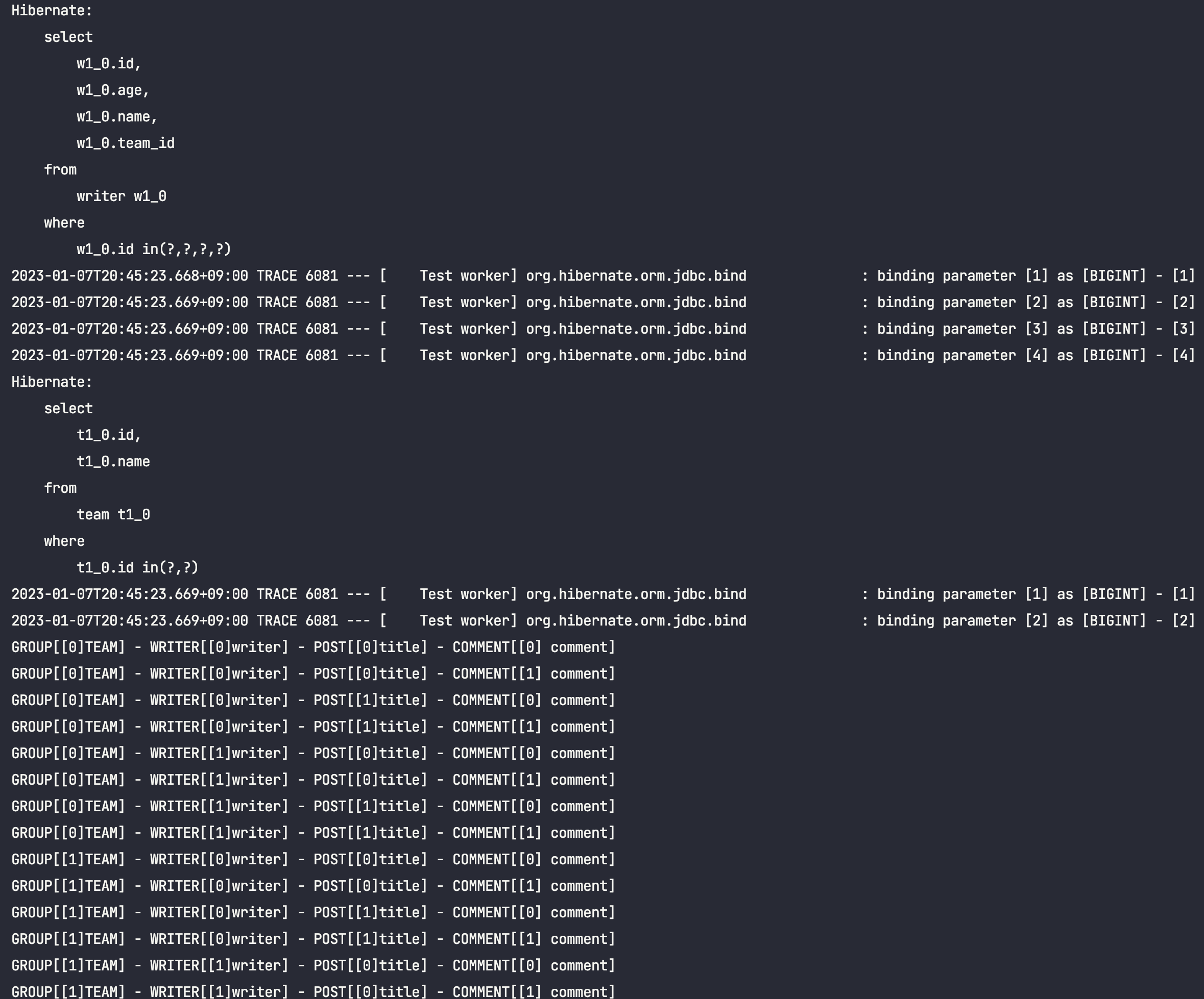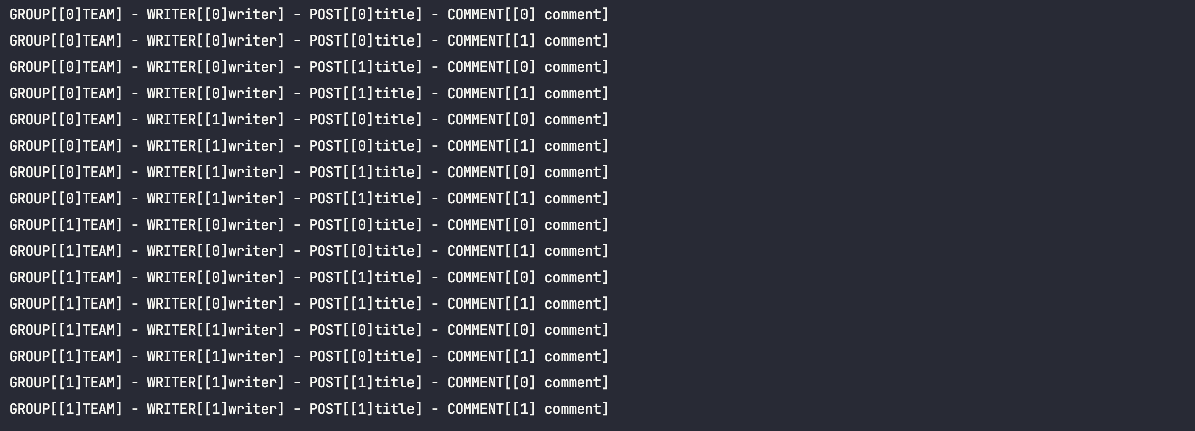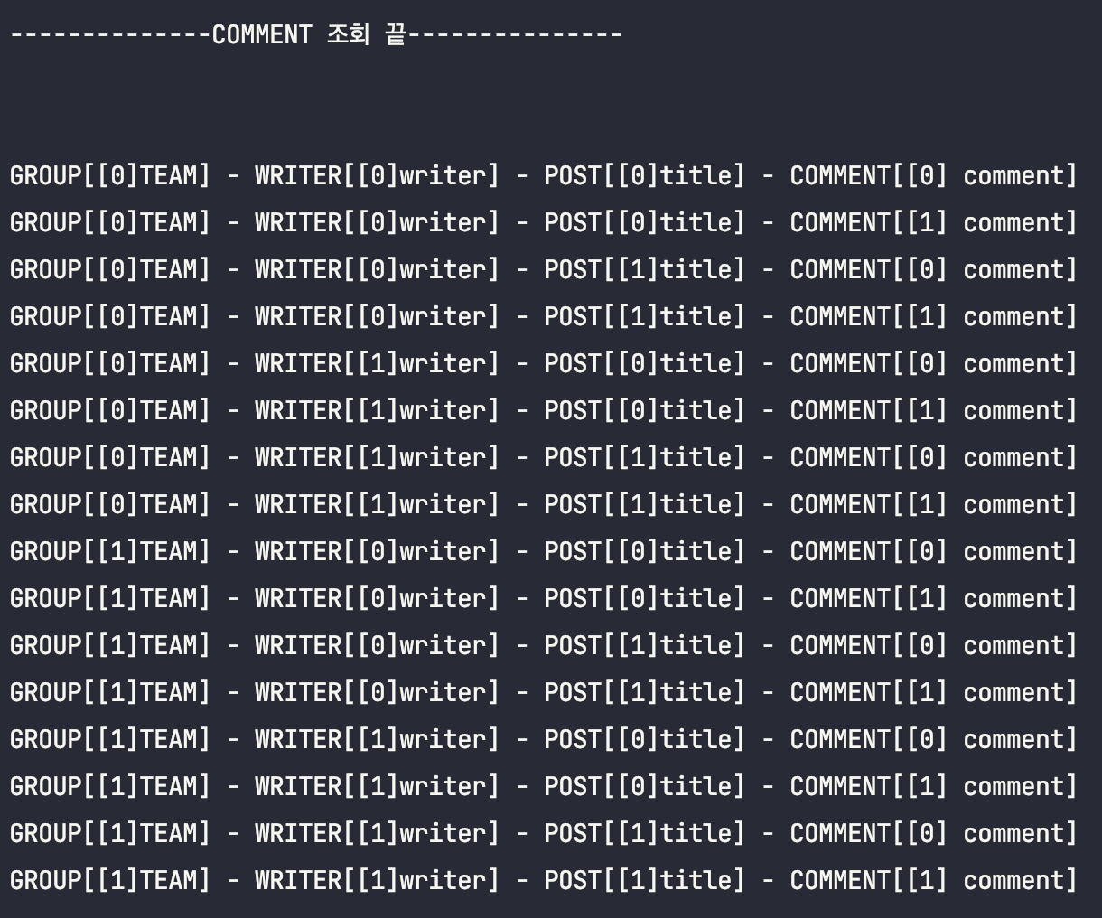 System.out.println("GROUP[%s] - WRITER[%s] - POST[%s] - COMMENT[%s]".formatted(writer.team().name(), writer.name(), post.title(), comment.content()));