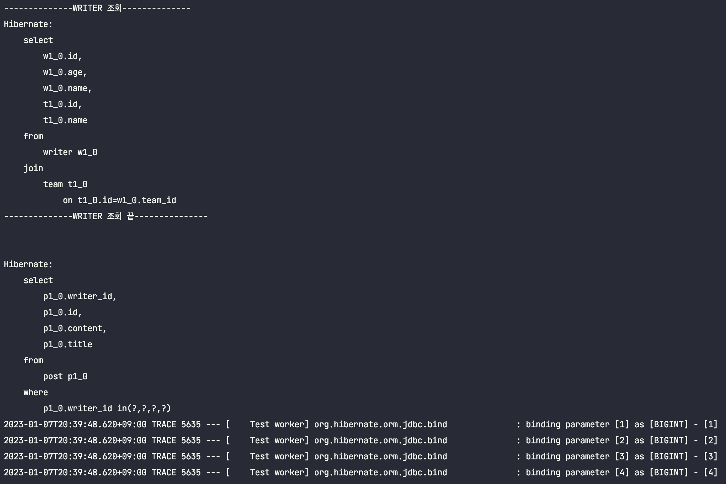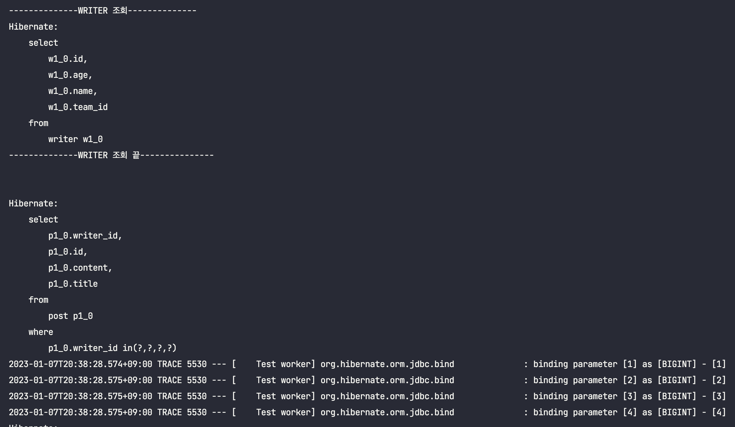 for (Post post : writer.posts()) { // writer๋น 1๋ฒ์ฉ, ์ด 4๋ฒ ๋ฐ์ - ๊ฐ ์ฟผ๋ฆฌ๋ง๋ค 2๊ฐ์ฉ post ์กฐํ
