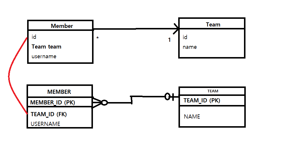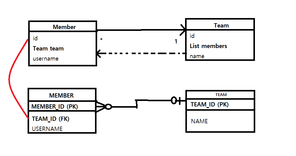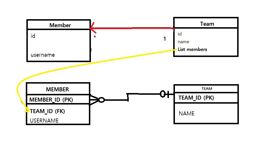 ํ์์ Member.team์ผ๋ก ํ ์ํฐํฐ๋ฅผ ์ฐธ์กฐํ ์ ์์ง๋ง, ๋ฐ๋๋ก ํ์๋ ํ์์ ์ฐธ์กฐํ๋ ํ๋๊ฐ ์์ต๋๋ค.