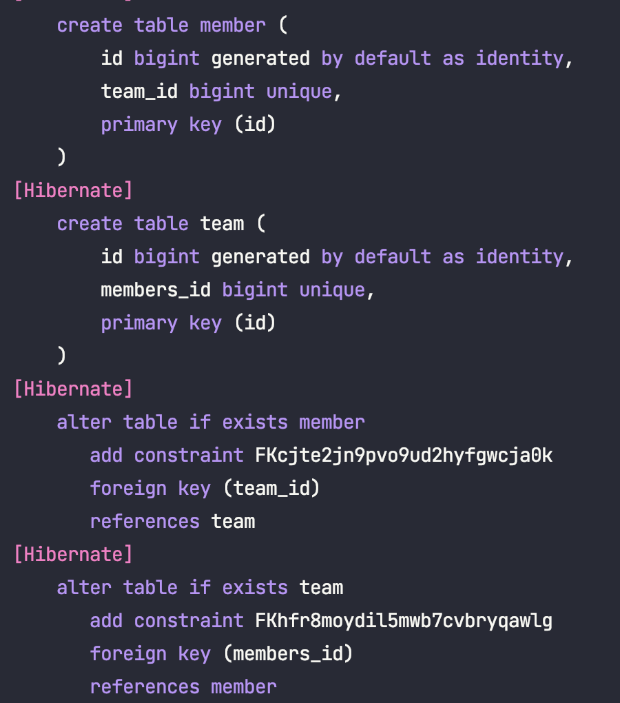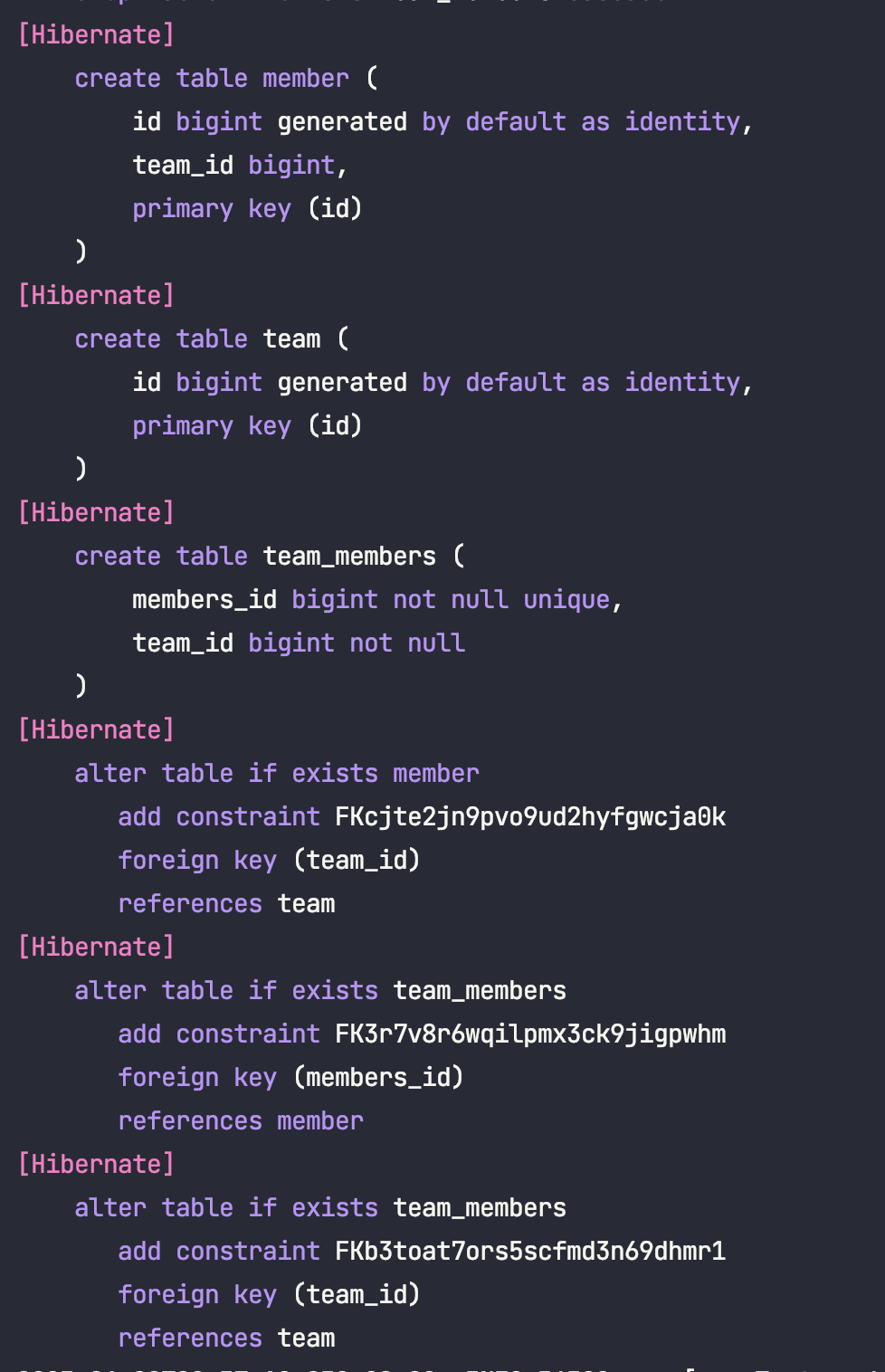 ์ผ๋๋ค ๋จ๋ฐฉํฅ ๊ด๊ณ๋ ํน์ดํ๊ฒ๋ Team ์ํฐํฐ์ Team.members๋ก MEMBER ํ ์ด๋ธ์ TEAM_ID ์ธ๋ ํค๋ฅผ ๊ด๋ฆฌํฉ๋๋ค.