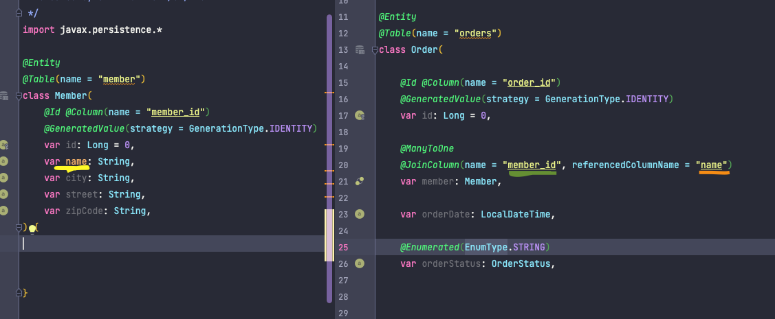 referencedColumnName์ ํตํด ๋์ ํ ์ด๋ธ์ ์ด๋ ํ ์ปฌ๋ผ์ FK๋ก ์ฌ์ฉํ ์ง ์ง์ ํ ์ ์์ต๋๋ค.