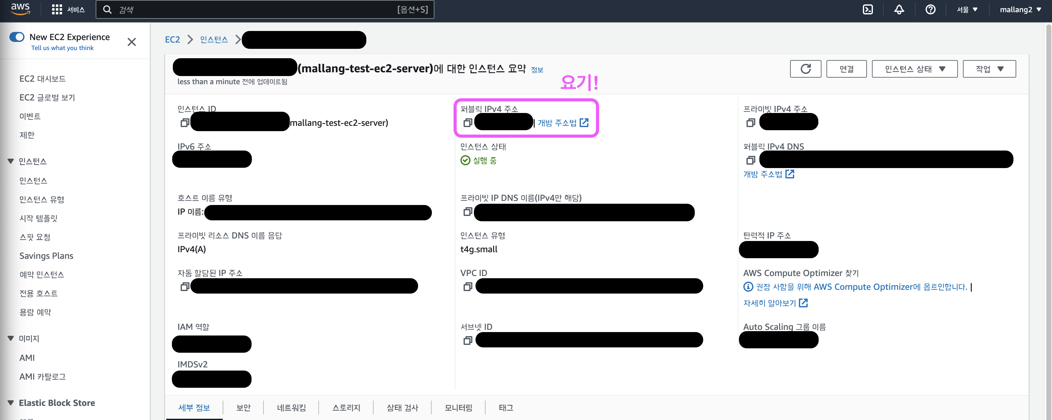 ์ฐ์ 8080 ํฌํธ๋ฅผ ์ฌ์ฉํ๋ค๋ ๊ฐ์ ํ์, ์๋ฒ์ ip ์ฃผ์๋ EC2 ์ธ์คํด์ค ์ ๋ณด์์ ํ์ธํ ์ ์์ต๋๋ค.