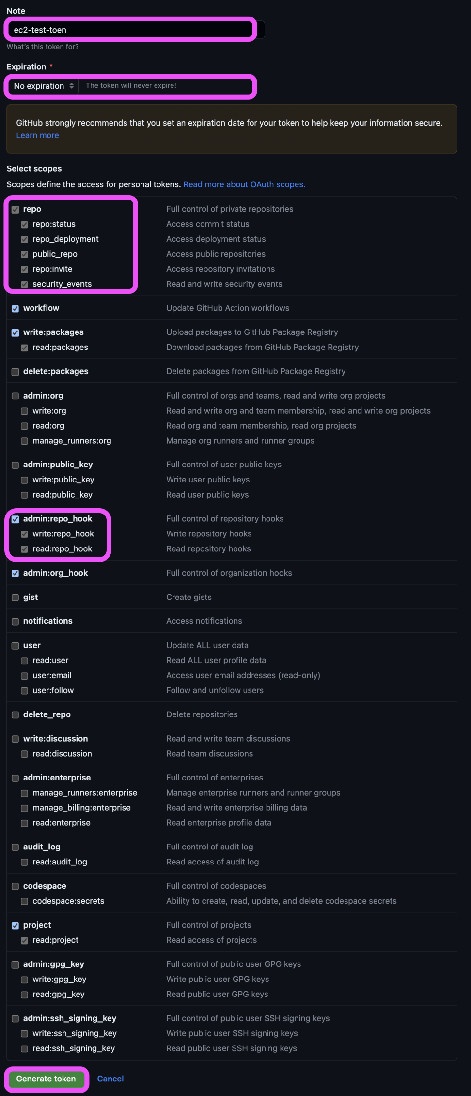 ํ์์ ์ธ ๋ถ๋ถ์ repo์ admin:repo_hook์ ๋ํ ๊ถํ์ด๊ณ , ๋๋จธ์ง ๋ถ๋ถ์ ๋ญ๊ฐ ํ์ํ ์๋ ์์ ๊ฑฐ ๊ฐ์์ ๋ช๊ฐ ์ค์ ํด ๋ณด์์ต๋๋ค.