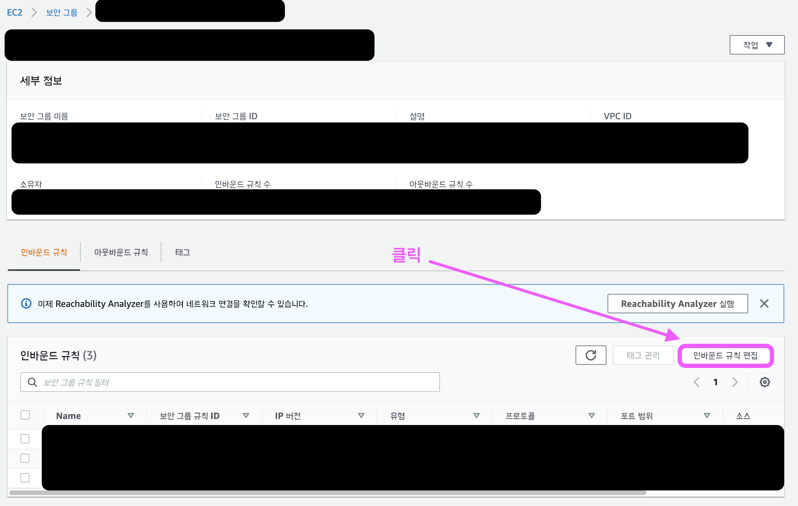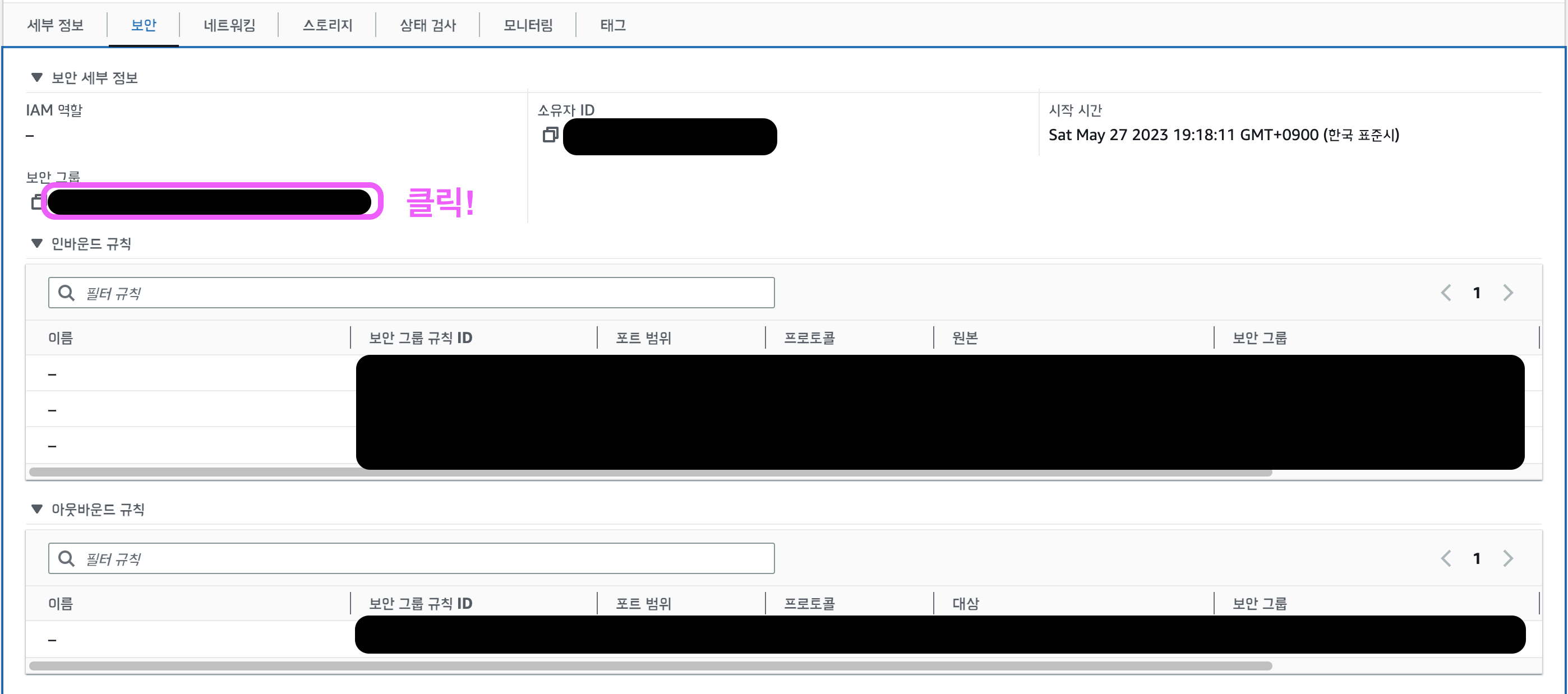 ๋ค์ ์ฌ์ฉ์ค์ธ EC2 ์ ๋ณดํ๋ฉด์ผ๋ก ๋์์์, ๋ณด์์ ํด๋ฆญํฉ๋๋ค.