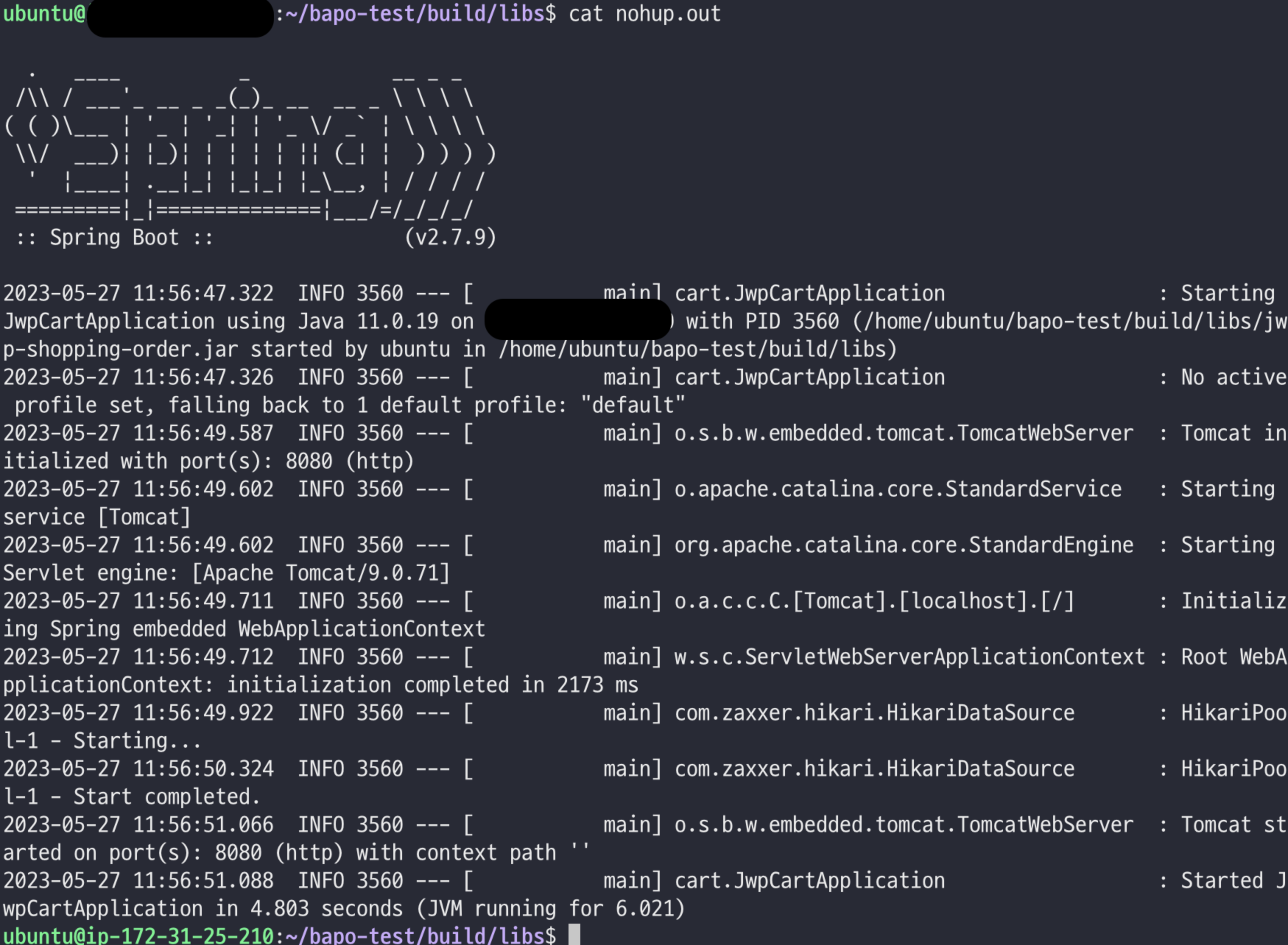 nohup์ ์ฌ์ฉํ๋ฉด nohup.out ํ์ผ์ด ์์ฑ๋๋๋ฐ์, cat nohup.out ๋ช ๋ น์ด๋ฅผ ํตํด ์ ํ๋ฆฌ์ผ์ด์ ์คํ ๋ก๊ทธ๋ฅผ ํ์ธํ ์ ์์ต๋๋ค.