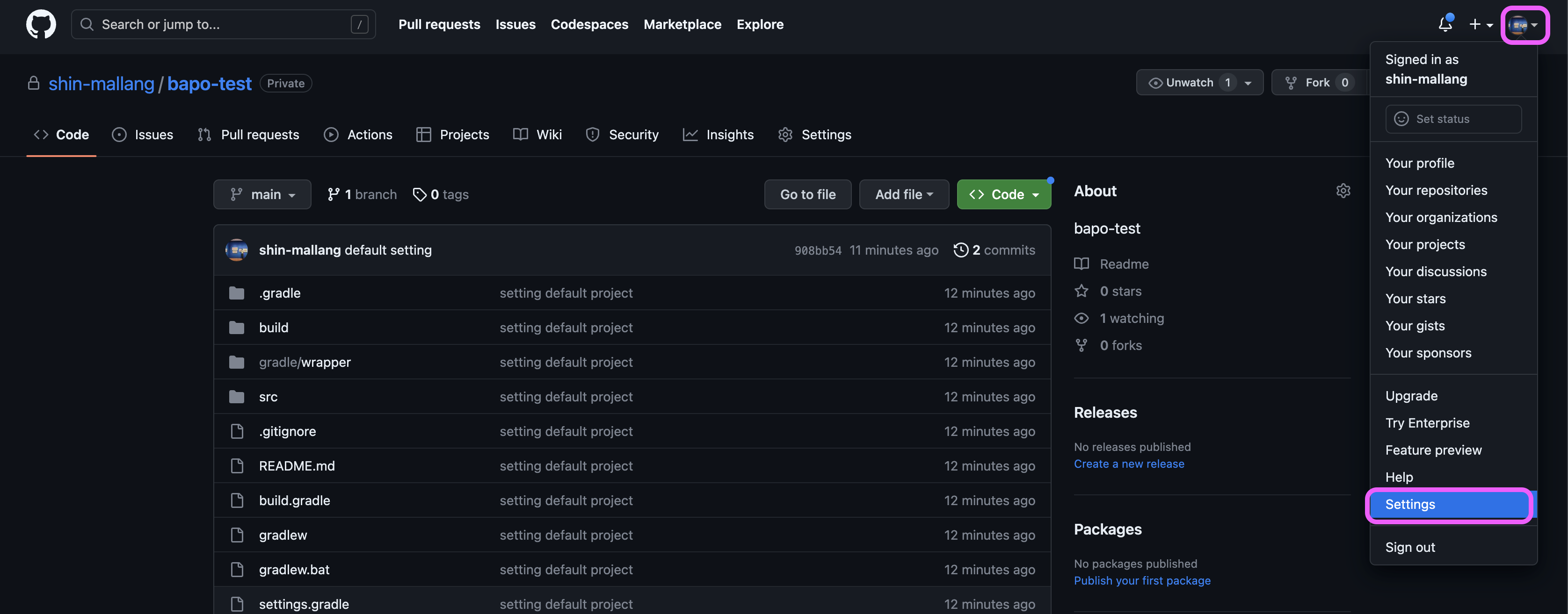 ๊นํ๋ธ ์ฐ์ธก ์๋จ์ ์์ ์ ํ๋กํ์ ํด๋ฆญํ ๋ค, Settings๋ฅผ ํด๋ฆญํฉ๋๋ค.