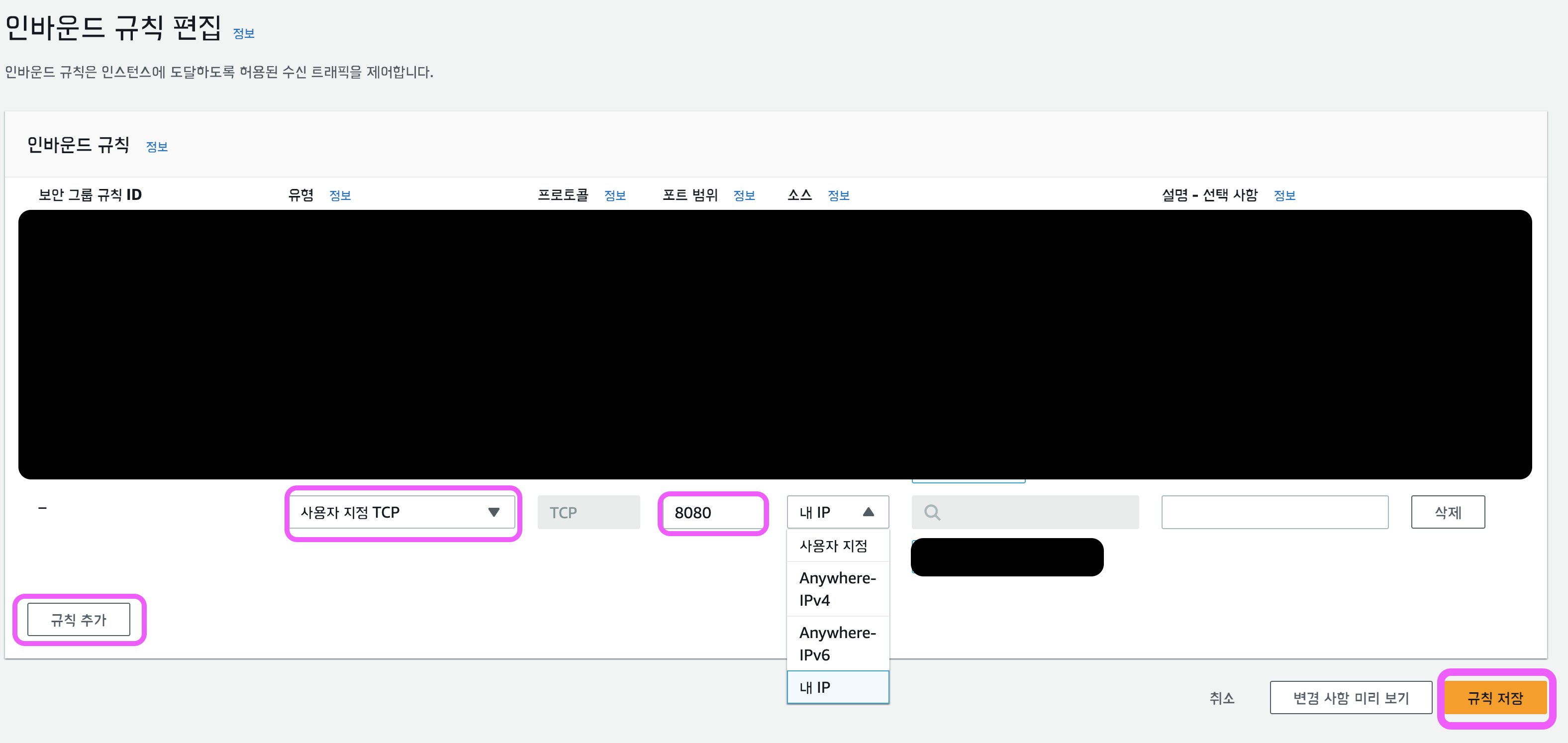 ๊ท์น ์ถ๊ฐ - ์ฌ์ฉ์ ์ง์ TCP - 8080 ํฌํธ - ๋ด IP๋ฅผ ์ ํํ๊ณ ๊ท์น์ ์ ์ฅํฉ๋๋ค.