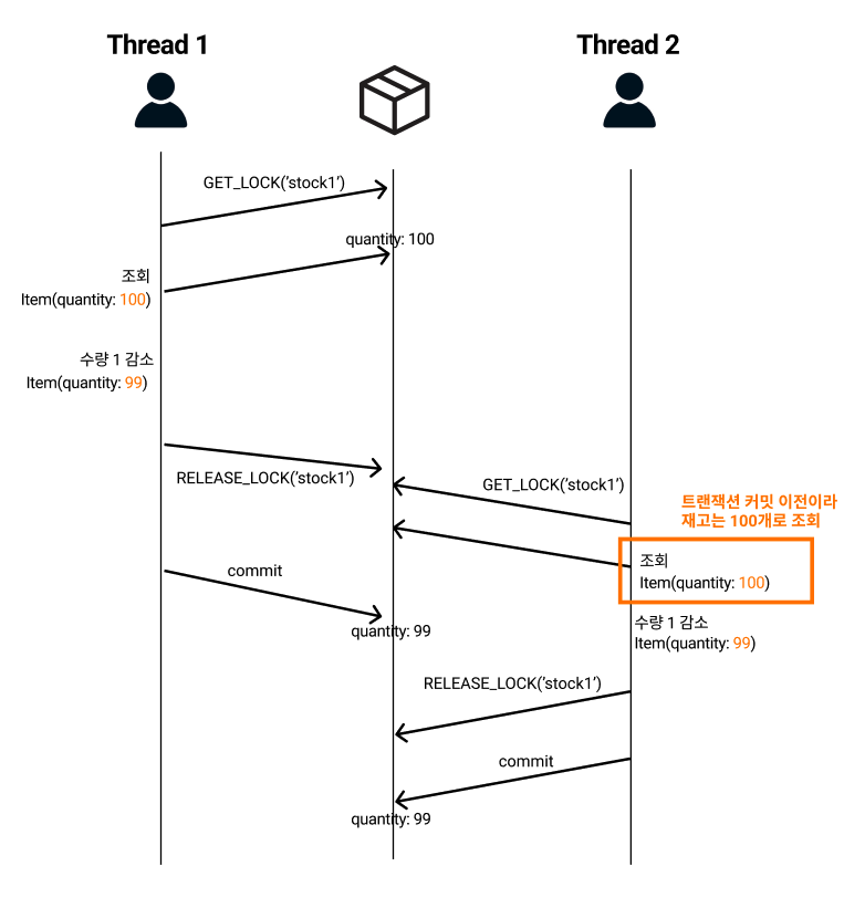 ๋ง์ฝ ๋ฝ ํ๋๊ณผ ์ฌ๊ณ ๊ฐ์ ๋ก์ง์ด ๋์ผ ํธ๋์ญ์ ์์ ๋ฐ์ํ๋ค๋ฉด ์๋์ ๊ฐ์ด ์ฌ์ ํ ๋์์ฑ ๋ฌธ์ ๊ฐ ๋ฐ์ํ๊ฒ ๋ฉ๋๋ค.