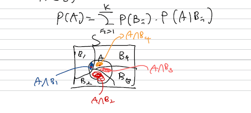 $$๋ฐ๋ผ์\;\; \forall{i}\;\; P(A) = \sum_{i=1}^{k}P(A|B_i)\cdot P(B_i)$$